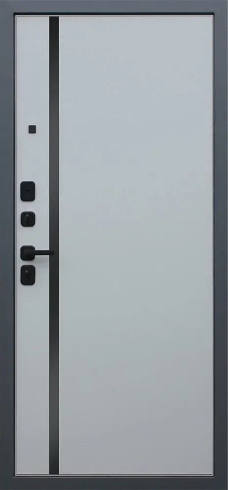 Порошковое покрытие Муар Серый Экошпонированная панель МДФ 10 мм (дизайн ФЛС). Цвет "ясень графит". Объемная фрезеровка. Вертикальная вставка из черного глянцевого лакобеля. Наличник МДФ 80 мм.
